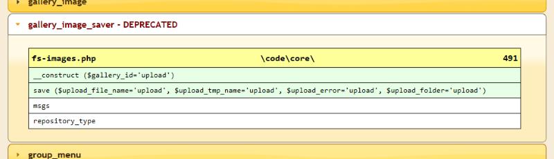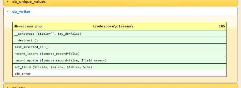 Here is one of the classes defined in the database access code (see example in table of contents above). Methods are shown with a green background and properties are shown with a white background. The yellow title bar shows the location of the class - filename, folder, and line number - making it easy to find the code for review.