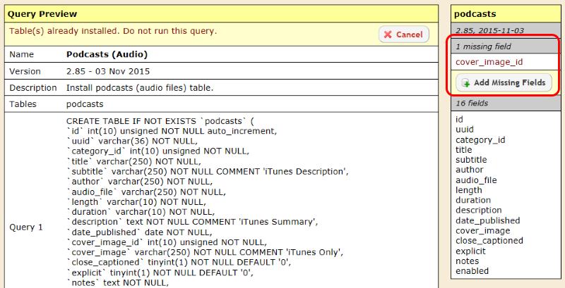 Here is an example of how the presence of the structure enables quick updates. In this case SiteCommander has detected that the table is already installed but also notes the absence of a field specified by its database structure.
